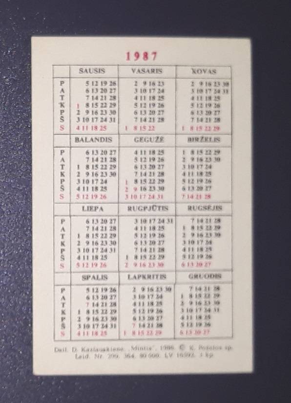 Kalendoriukas Lietuva 1987 WILDLIFE Dru =09=