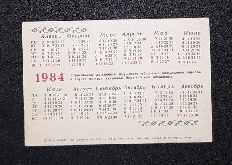 Kalendoriukas CCCP 1984 Draudimas 154