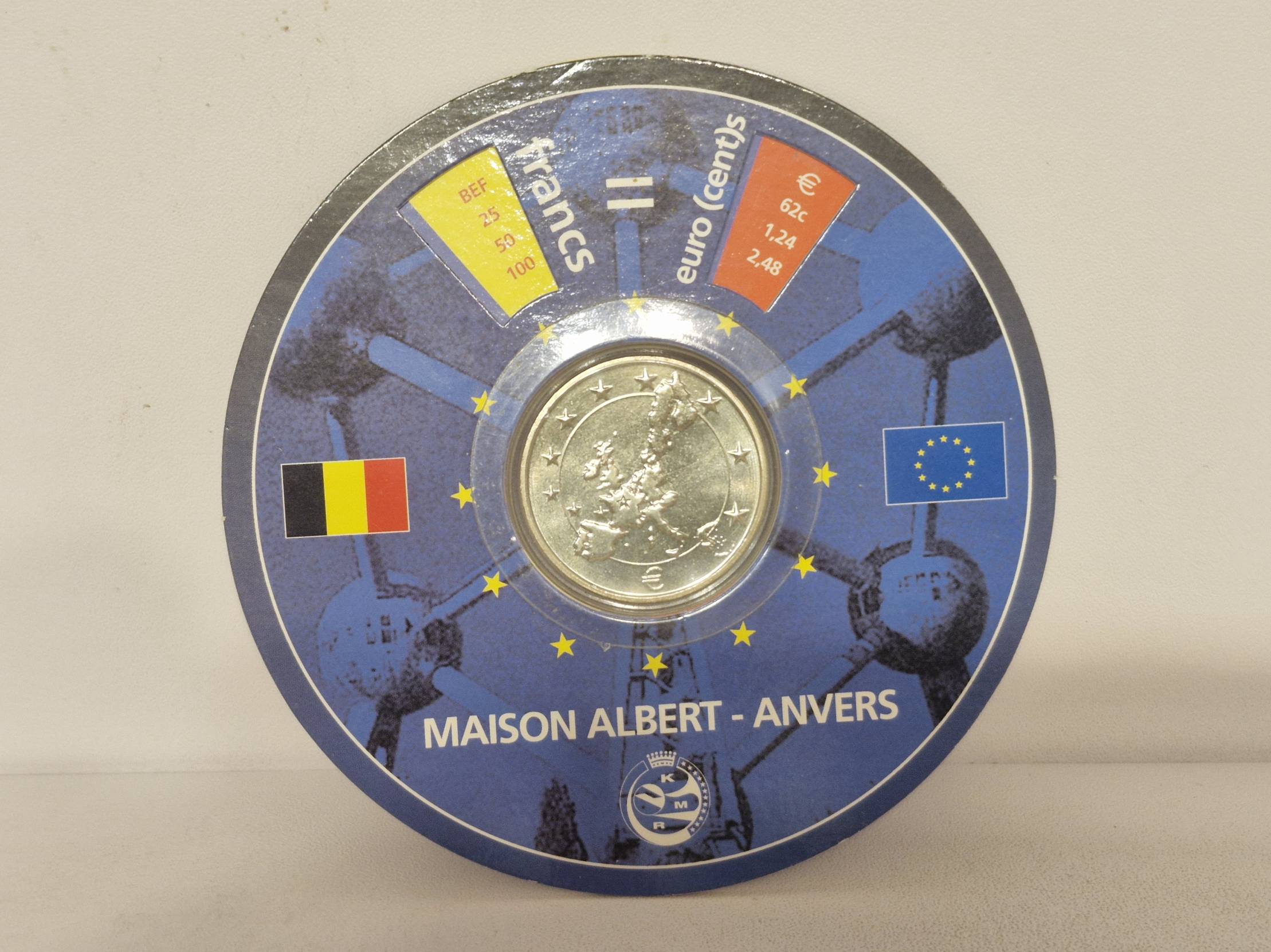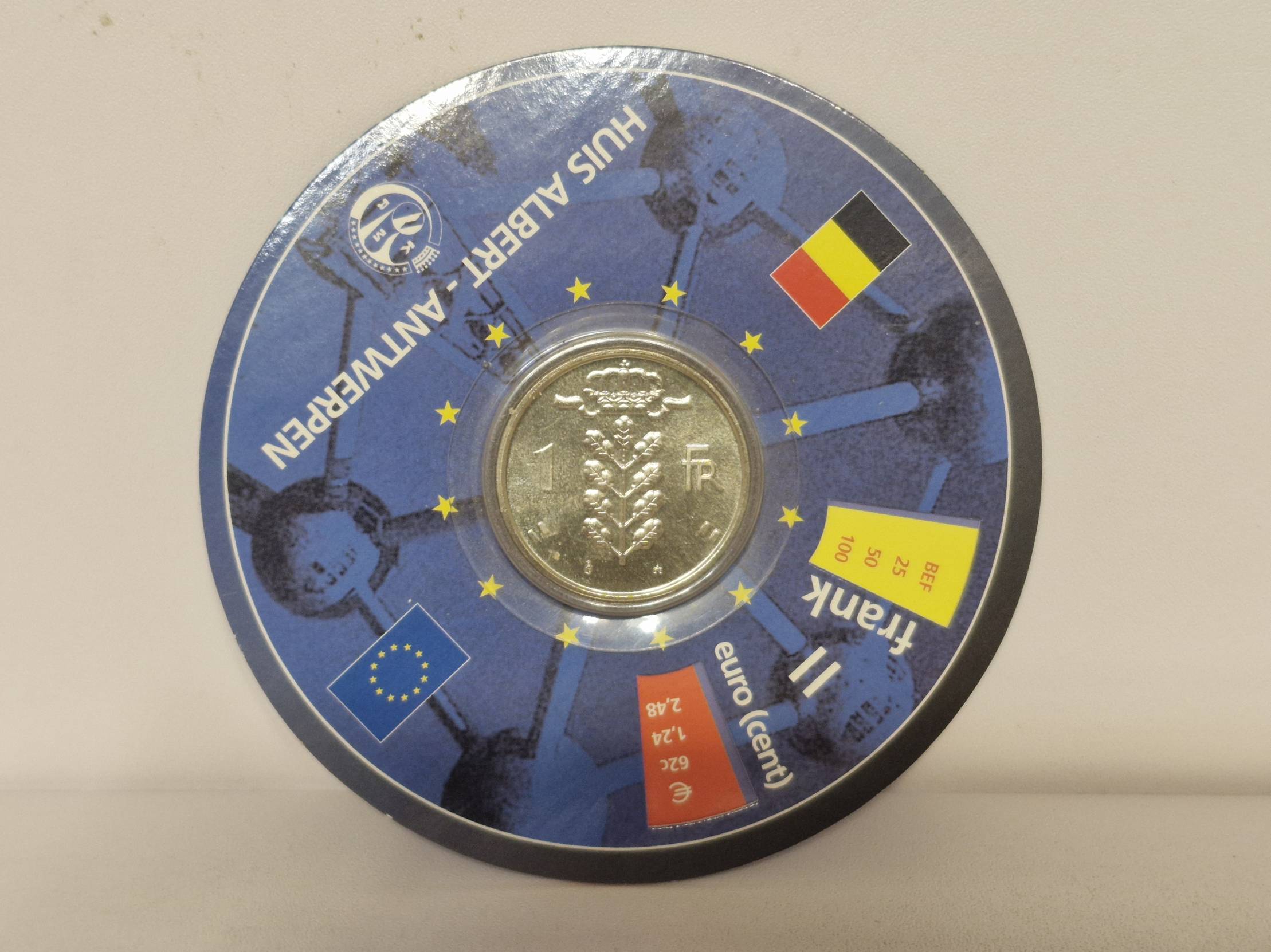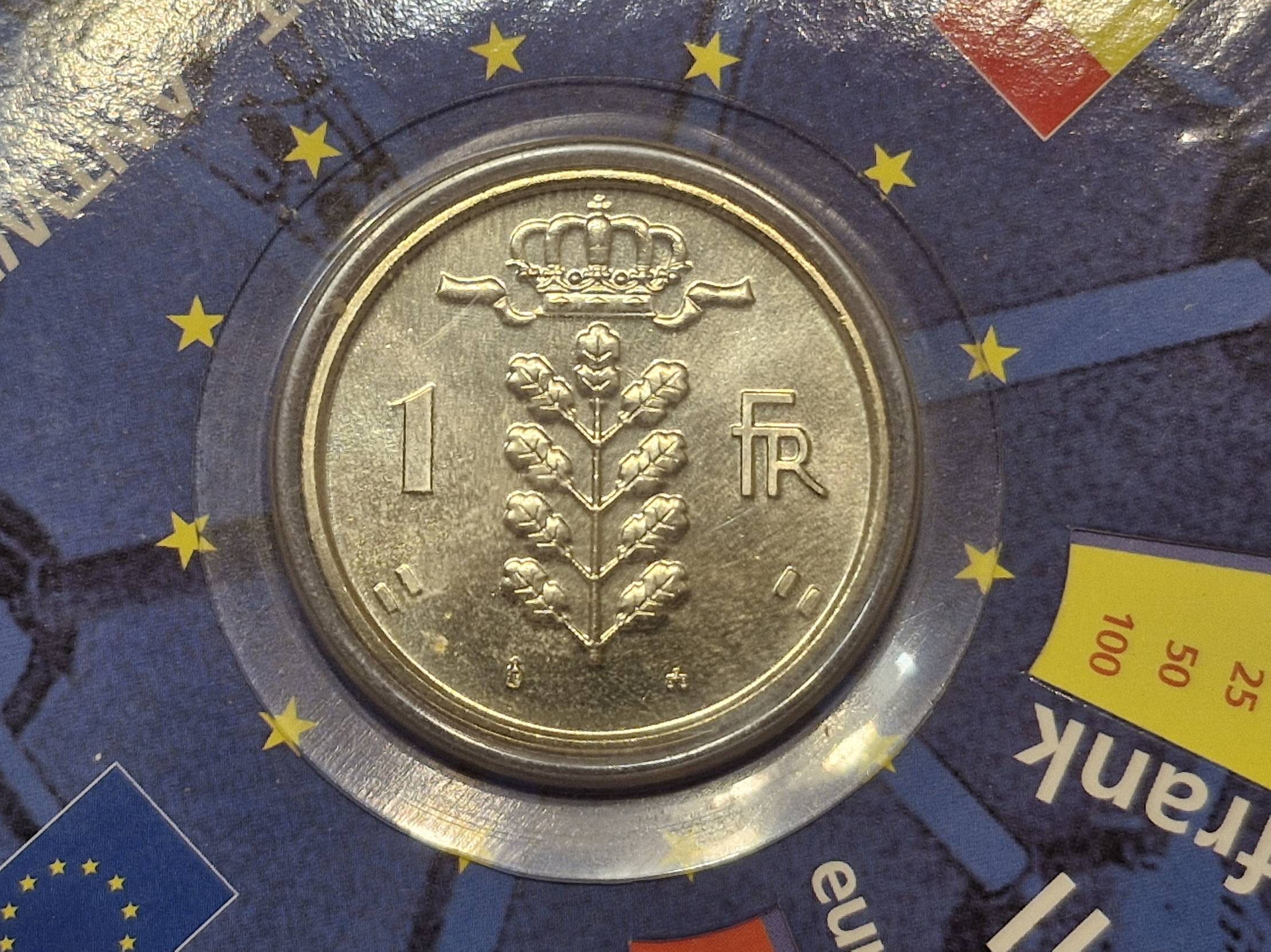 Tai yra Belgijos 1 franko moneta (žetonas), išleista kaip suvenyras ar konverteris, skirtas palengvinti perėjimą nuo Belgijos franko prie euro.