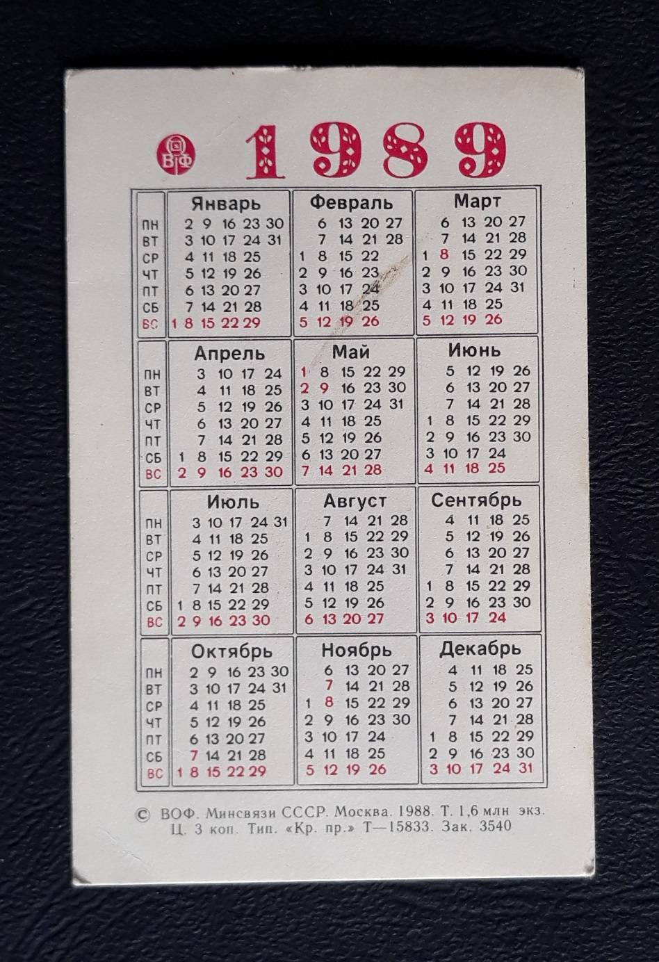 Kalendoriukas CCCP 1989 Filat. WILDLIFE 063