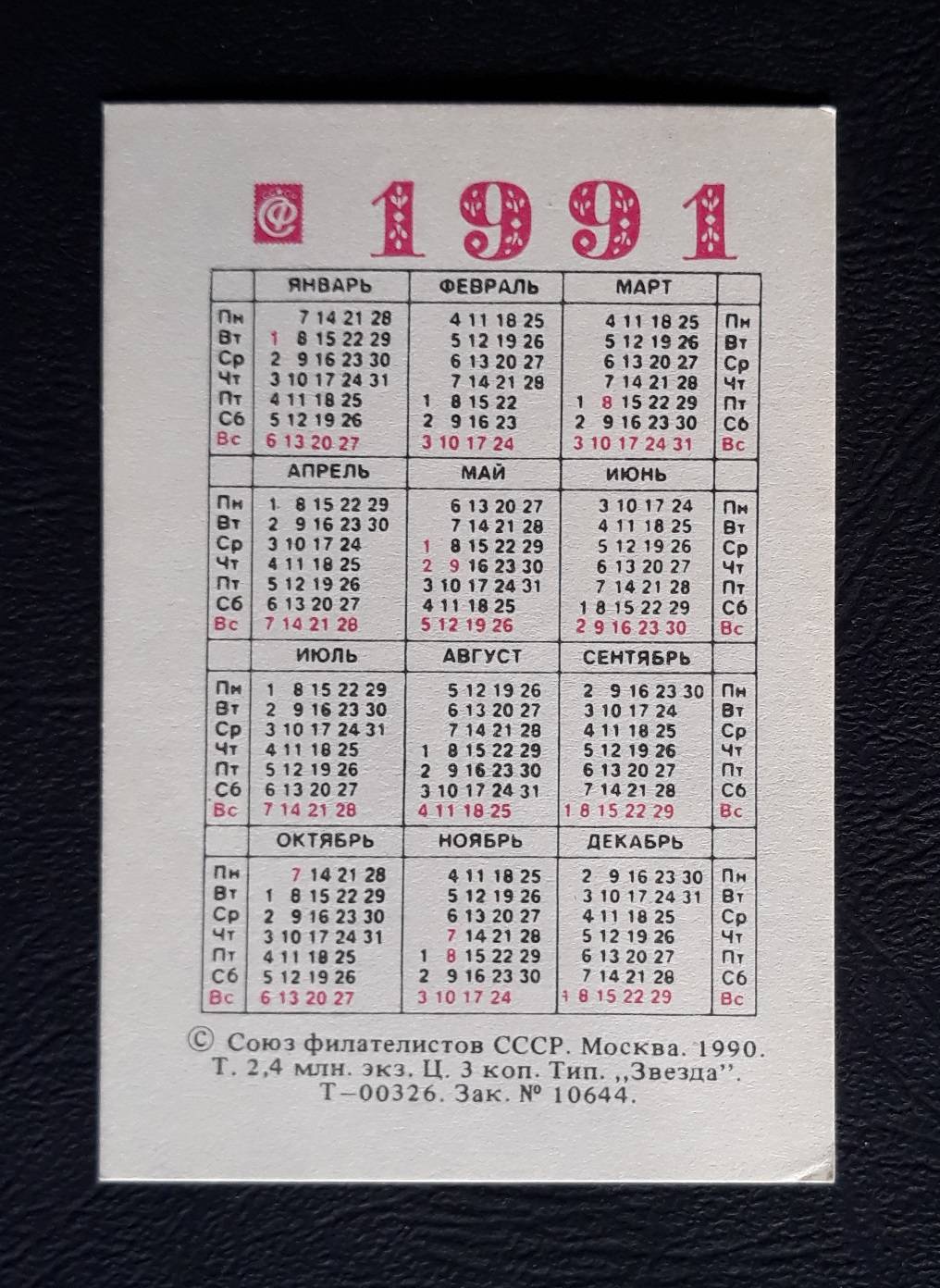 Kalendoriukas CCCP 1991 Filat. WILDLIFE 038
