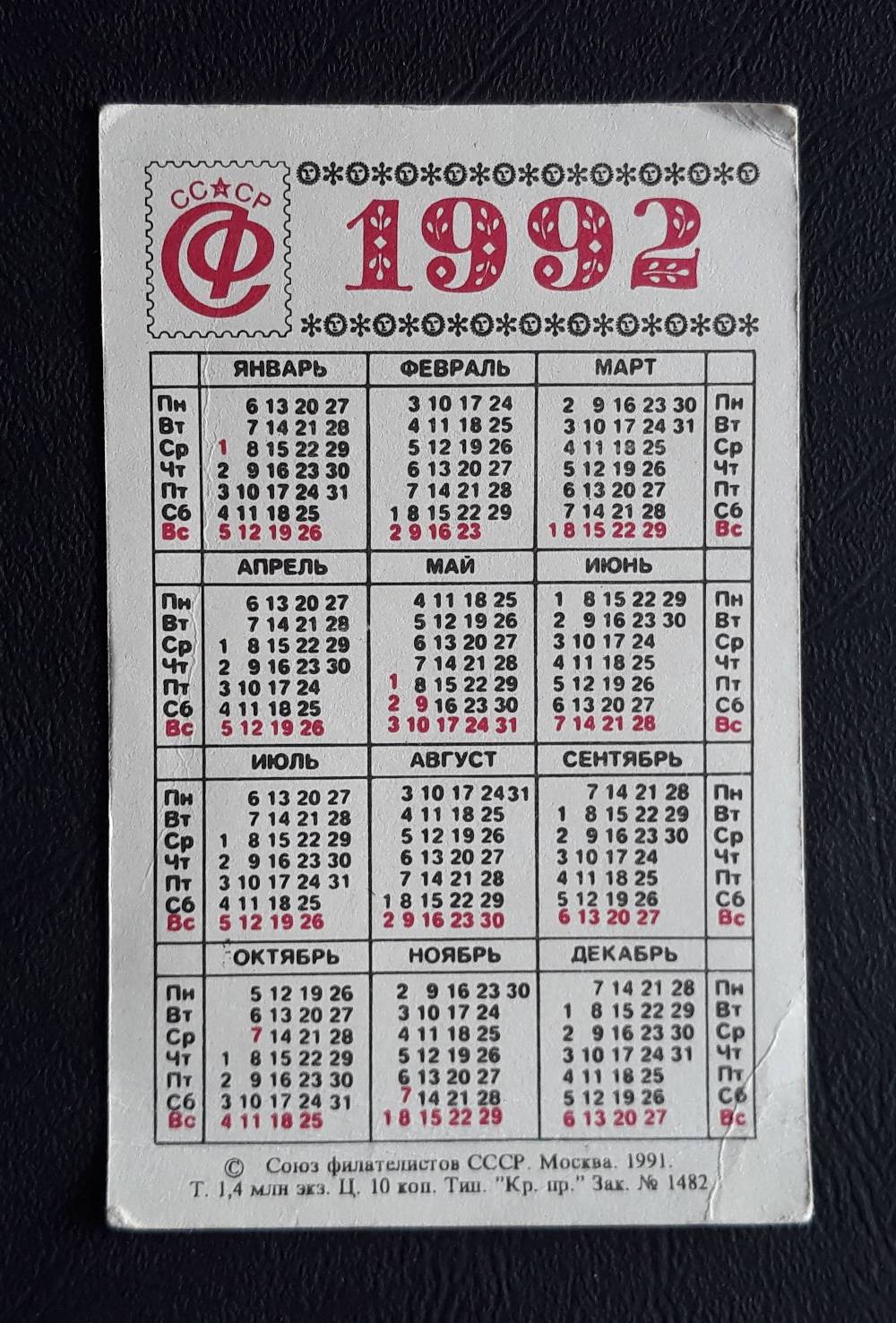 Kalendoriukas CCCP 1992 Filat. WILDLIFE 006