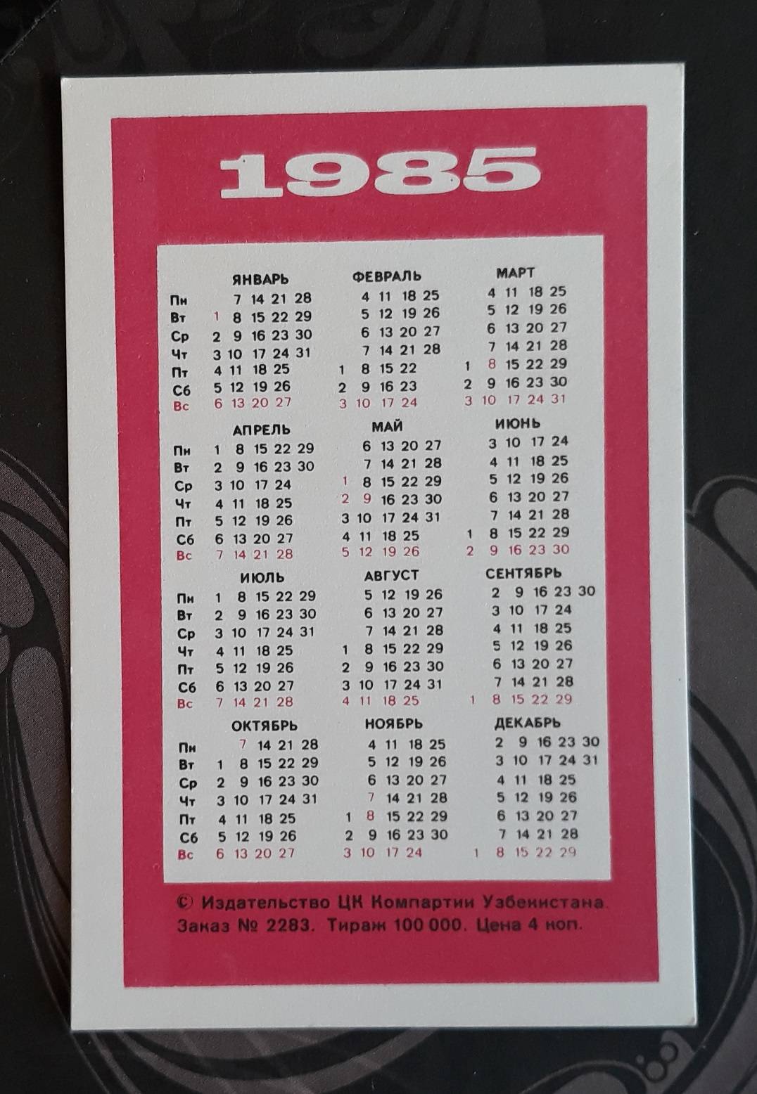 Kalendoriukas CCCP 1985 WILDLIFE 118-2 Uzbek
