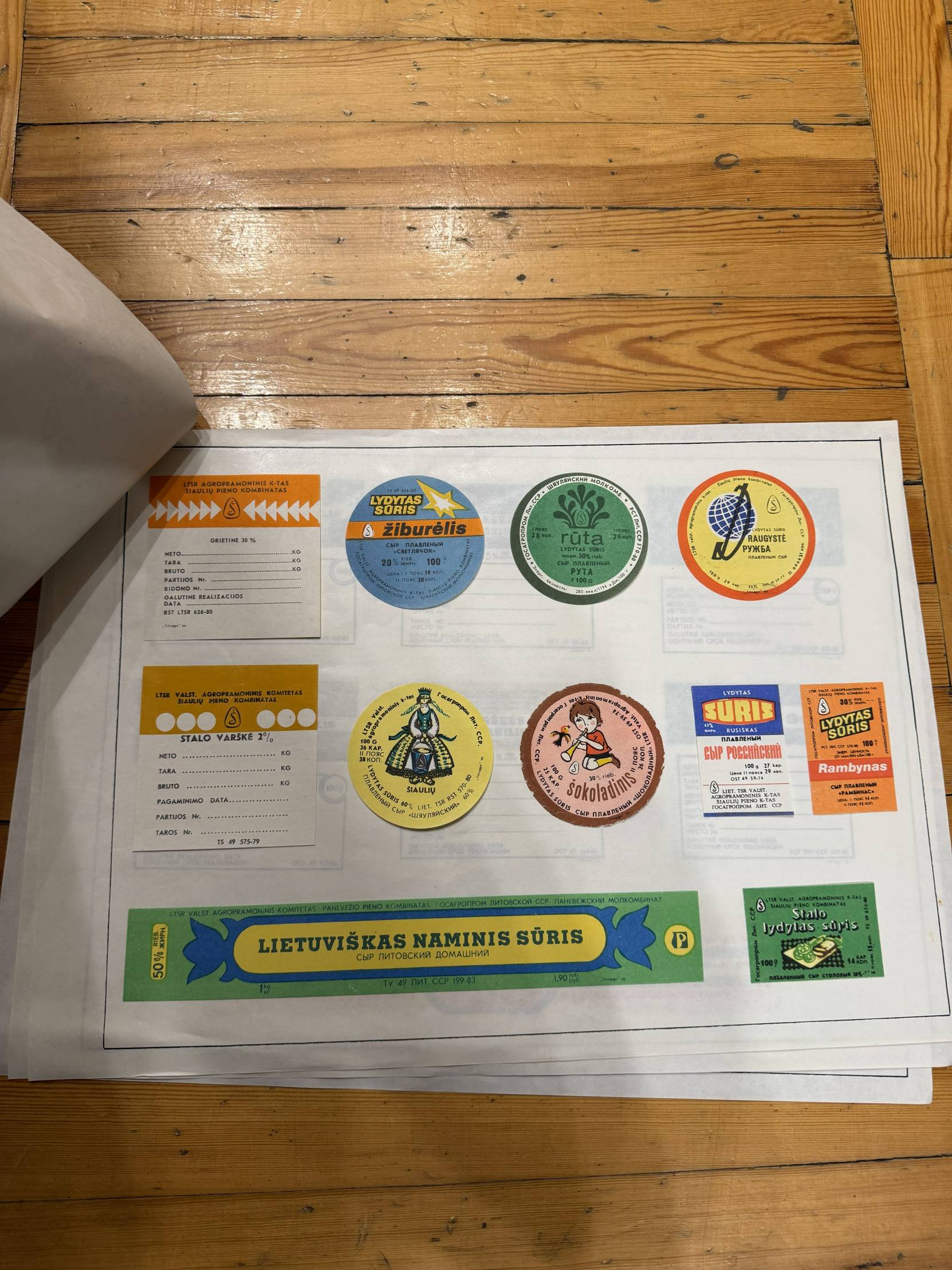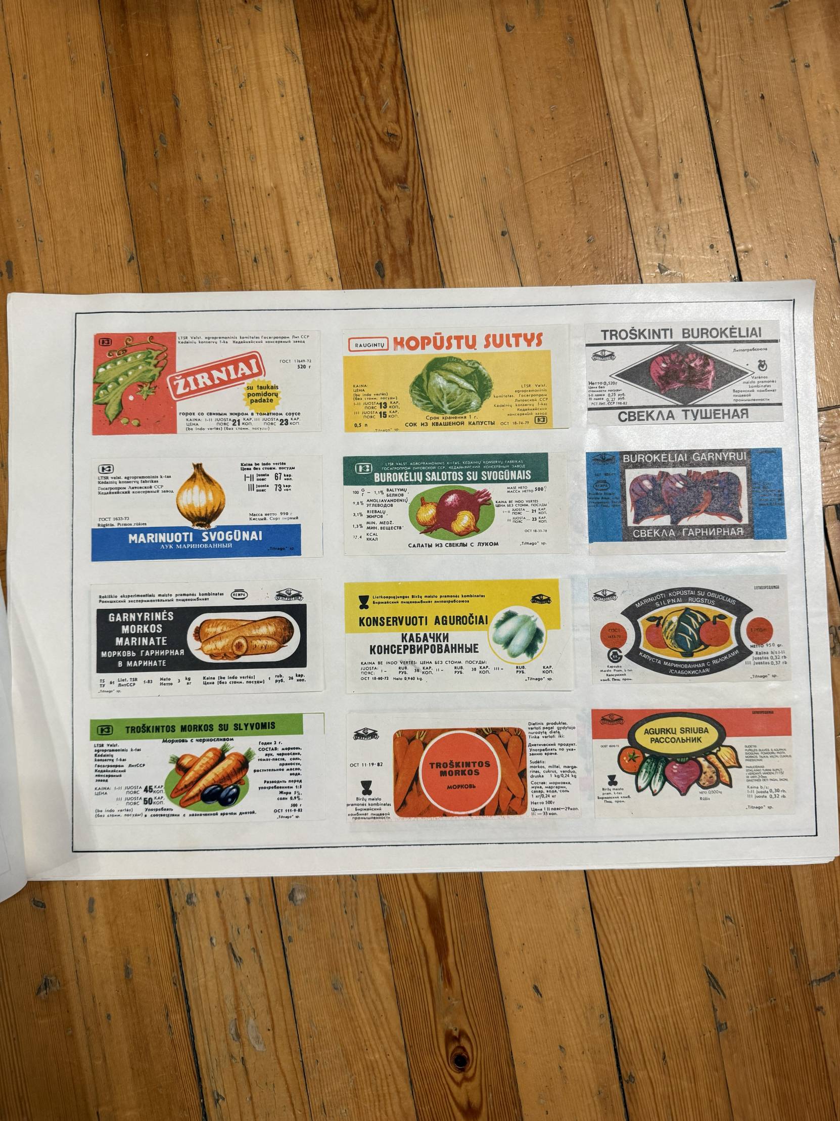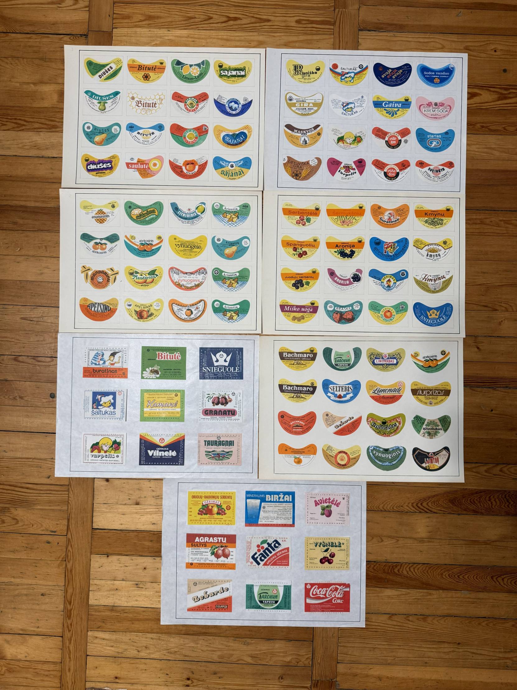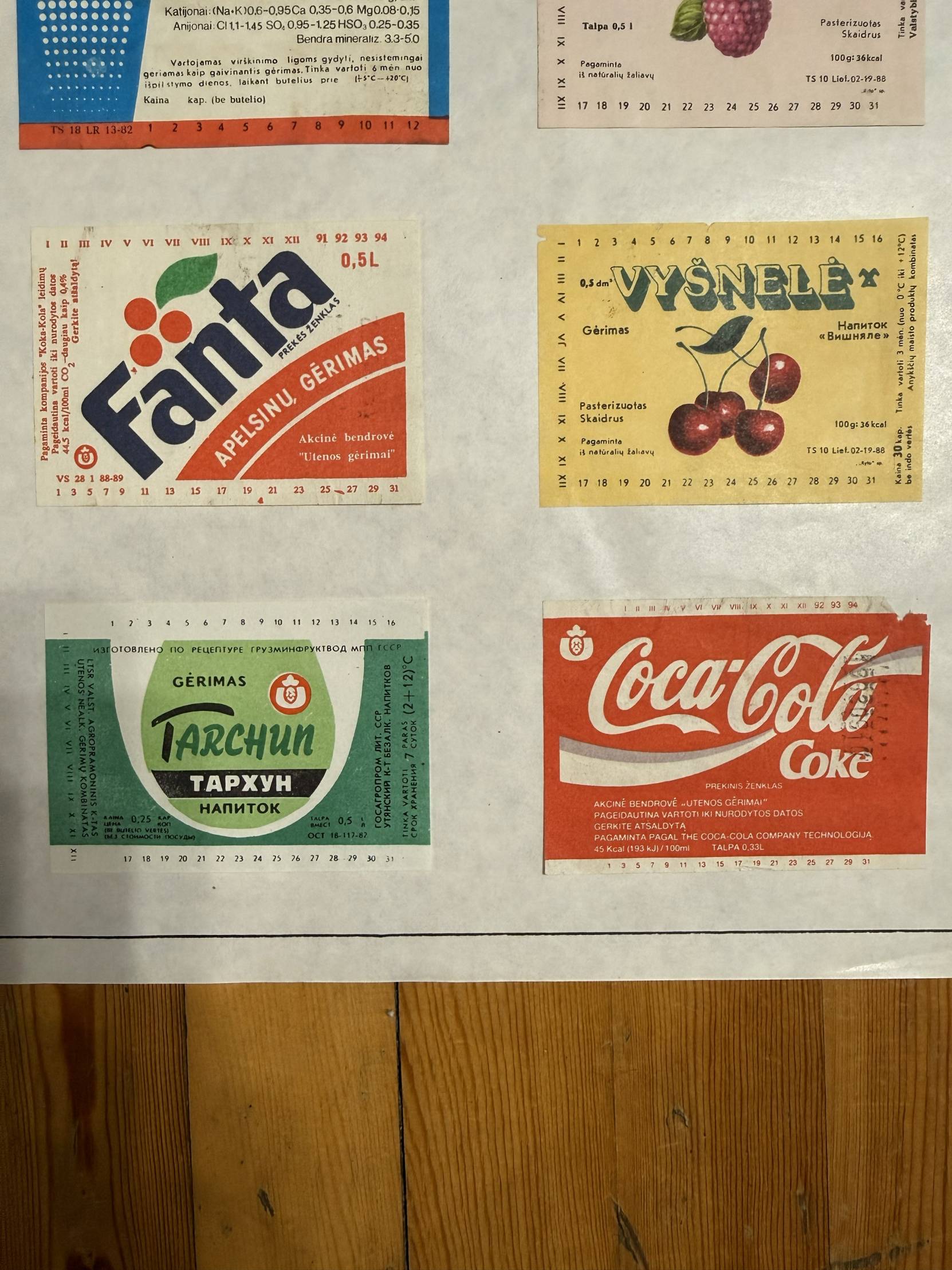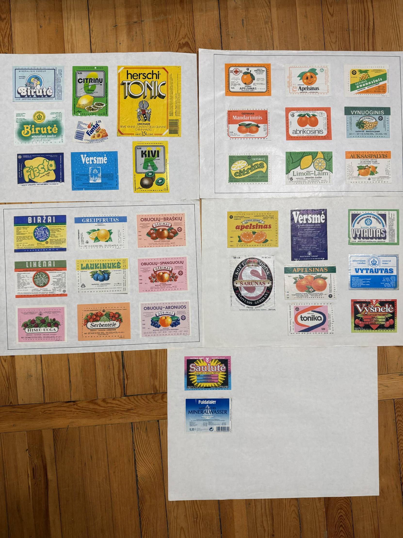 Rinkinyje yra etiketės nuo: gaiviųjų gėrimų, sulčių, medaus, kompotų, alaus, degtinės ir kitų alkoholinių gėrimų, konservų, pieno produktų, mėsos gaminių, saldainių, kavos ir konditerijos, vaistų, gydomųjų arbatų.