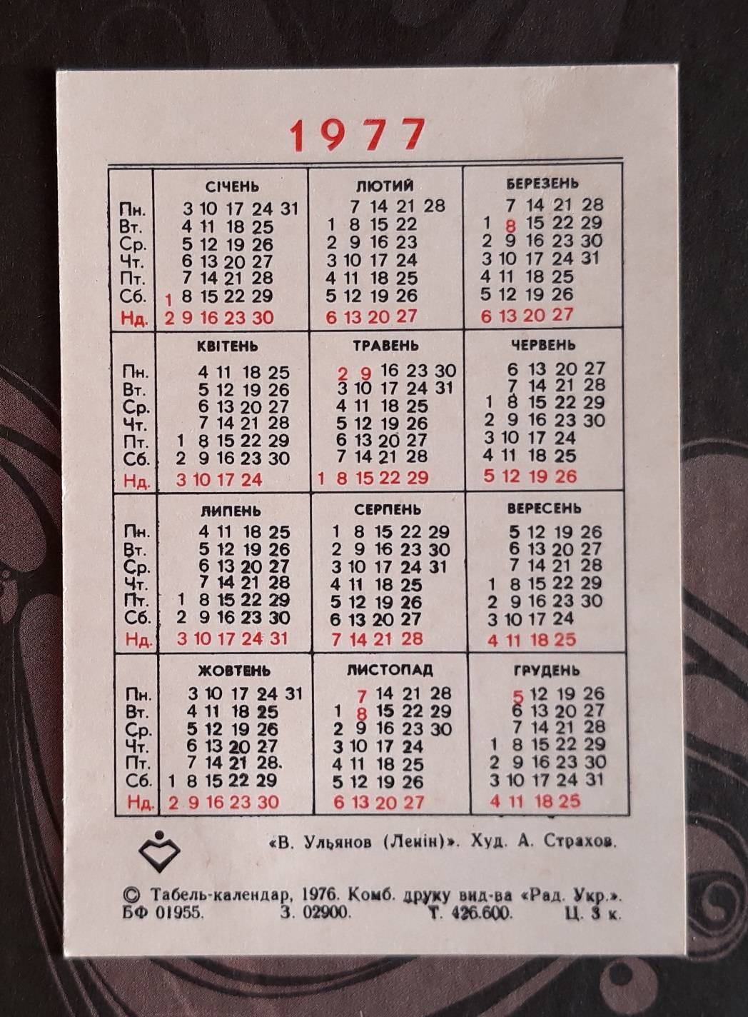 Kalendoriukas CCCP 1977 Leninas 010-2