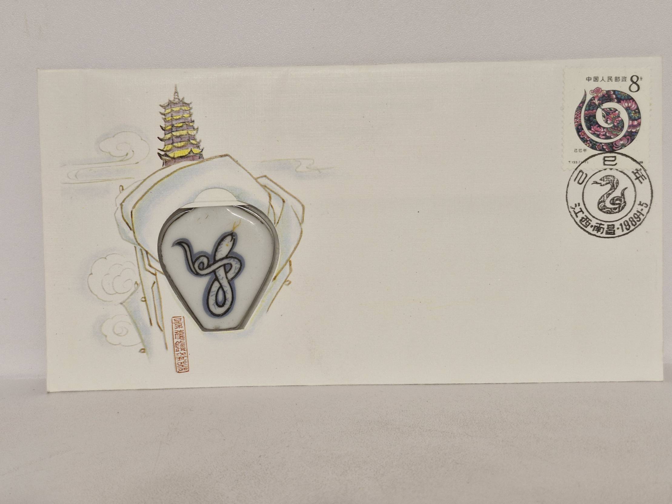 Kolekcinis Kinijos pašto proginis vokas su originaliu antspaudu ir porcelianiniu Zodiako simbolio medalionu – Gyvatė. Leidimo metai: 1989m.