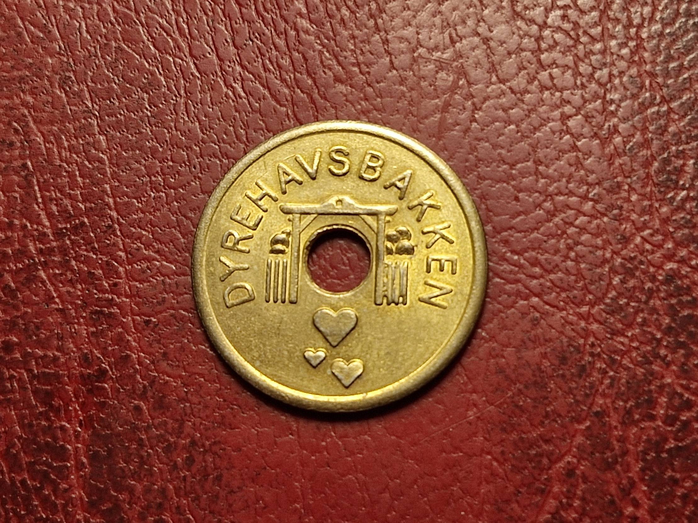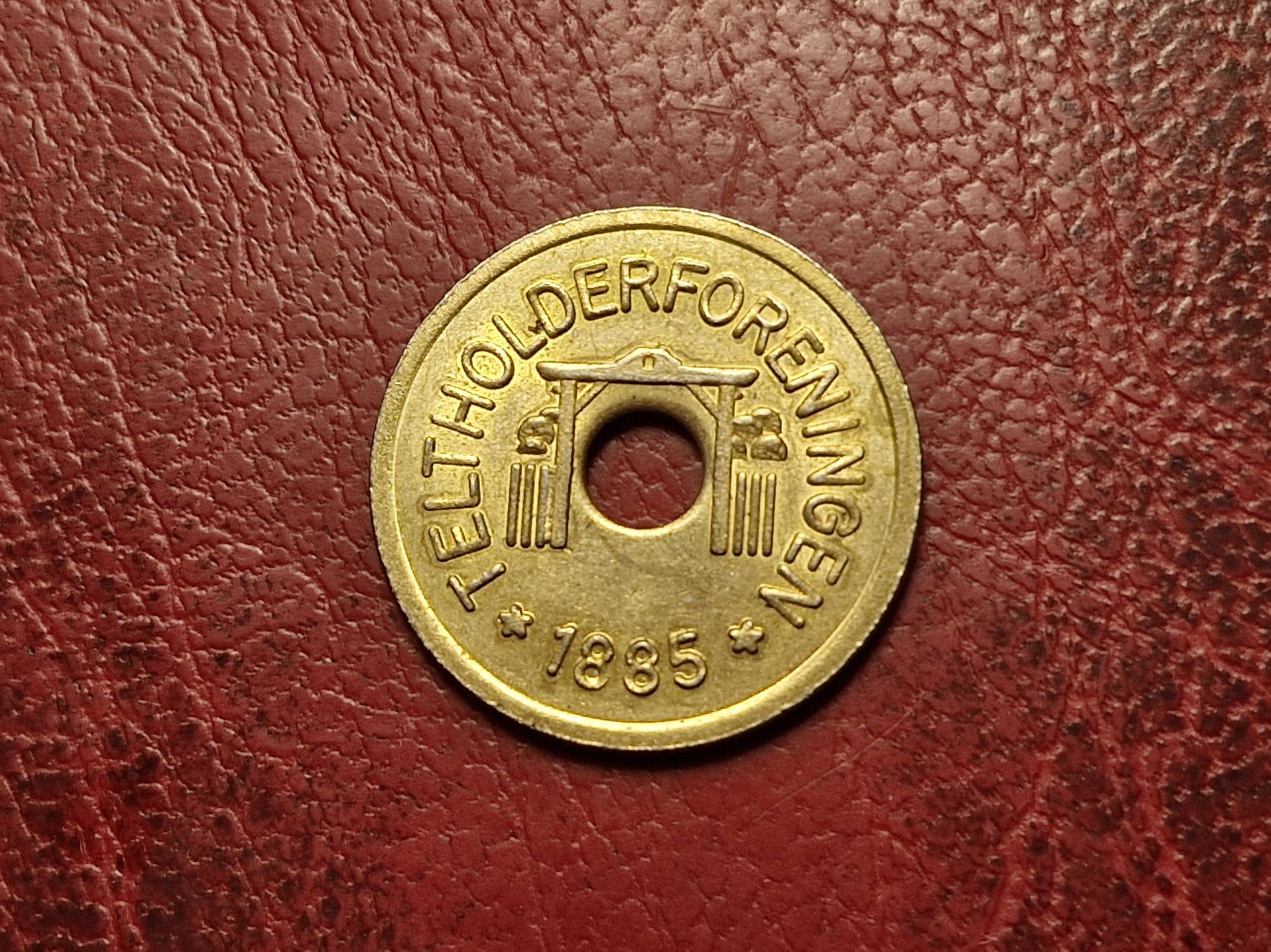 Parduodamas suvenyrinis žalvarinis žetonas su užrašu „Dyrehavsbakken“ ir „Teltholderforeningen 1885“.
