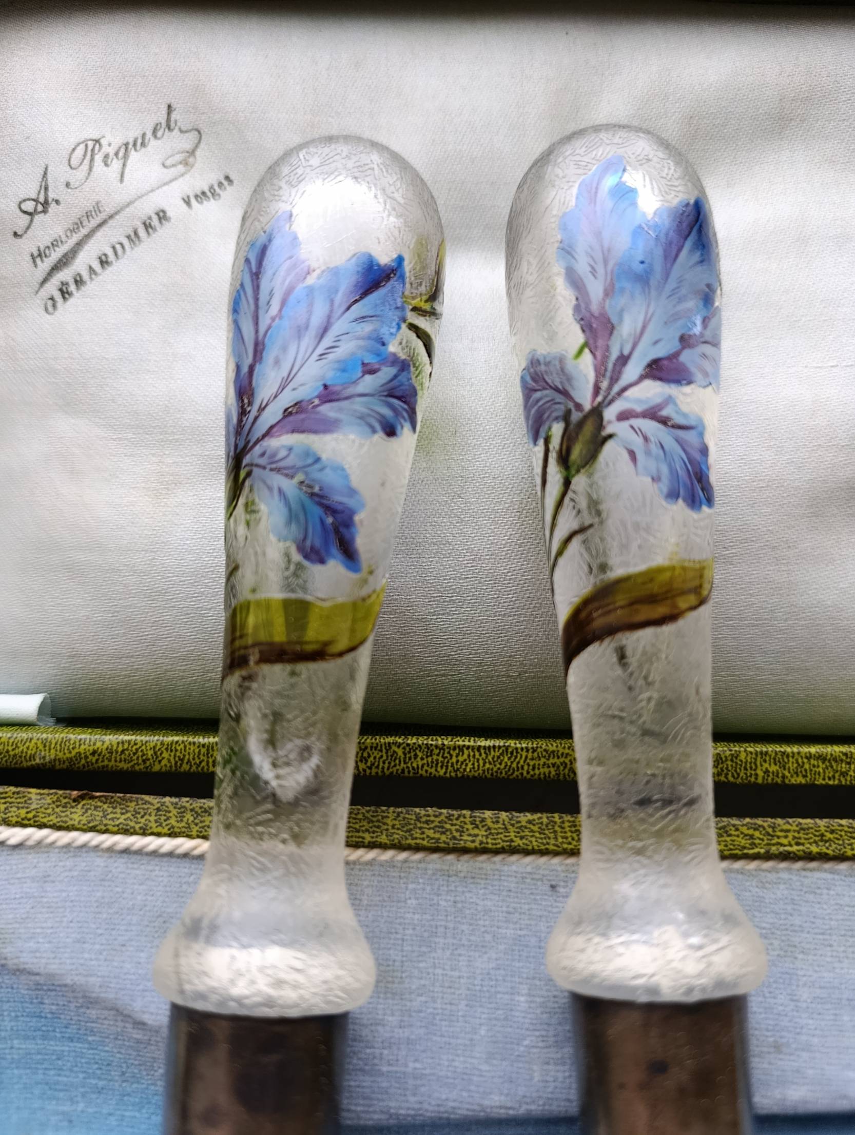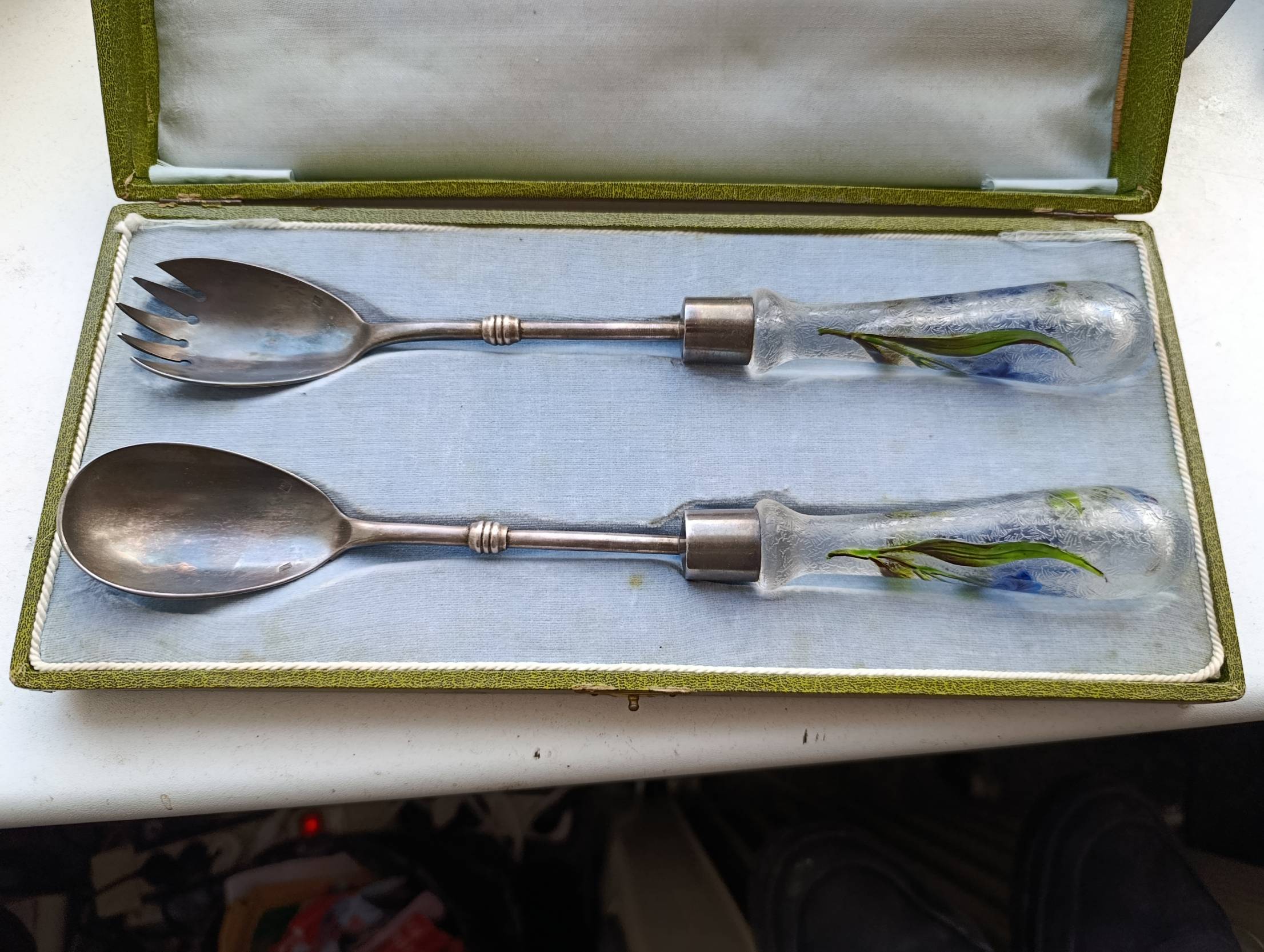 Parduodamas originalus XX a. pradžios prancūziškas serviravimo komplektas dėžutėje. Tai elegantiškas stalo įrankių rinkinys, skirtas salotoms, desertams ar vaisiams serviruoti.