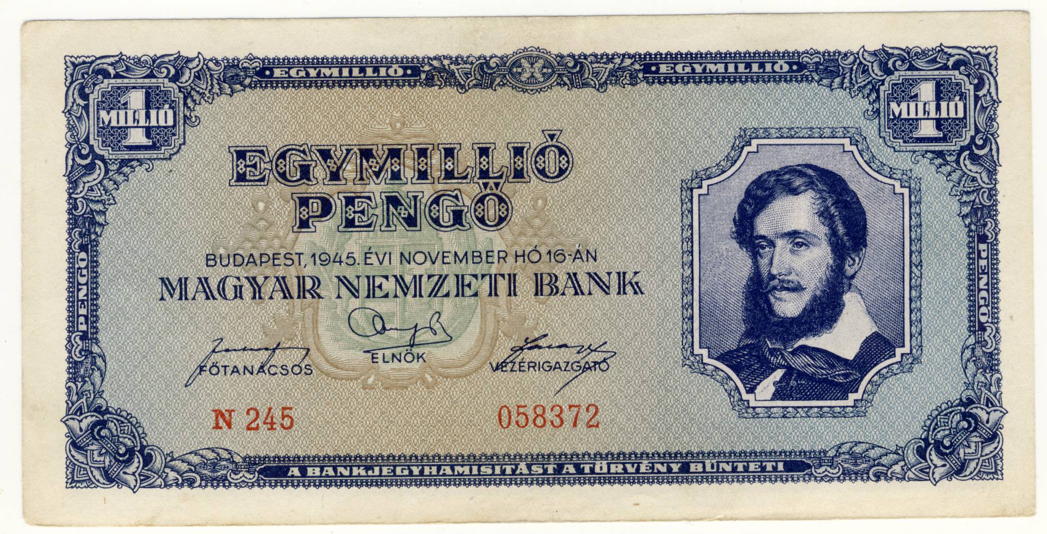 Vengrija 1.000.000 pengų 1945 m., P#122, VF(3)