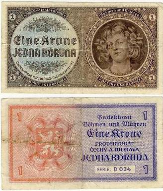 Bohemija ir Moravija 1 krona ND(1940), P#3a, VF-
