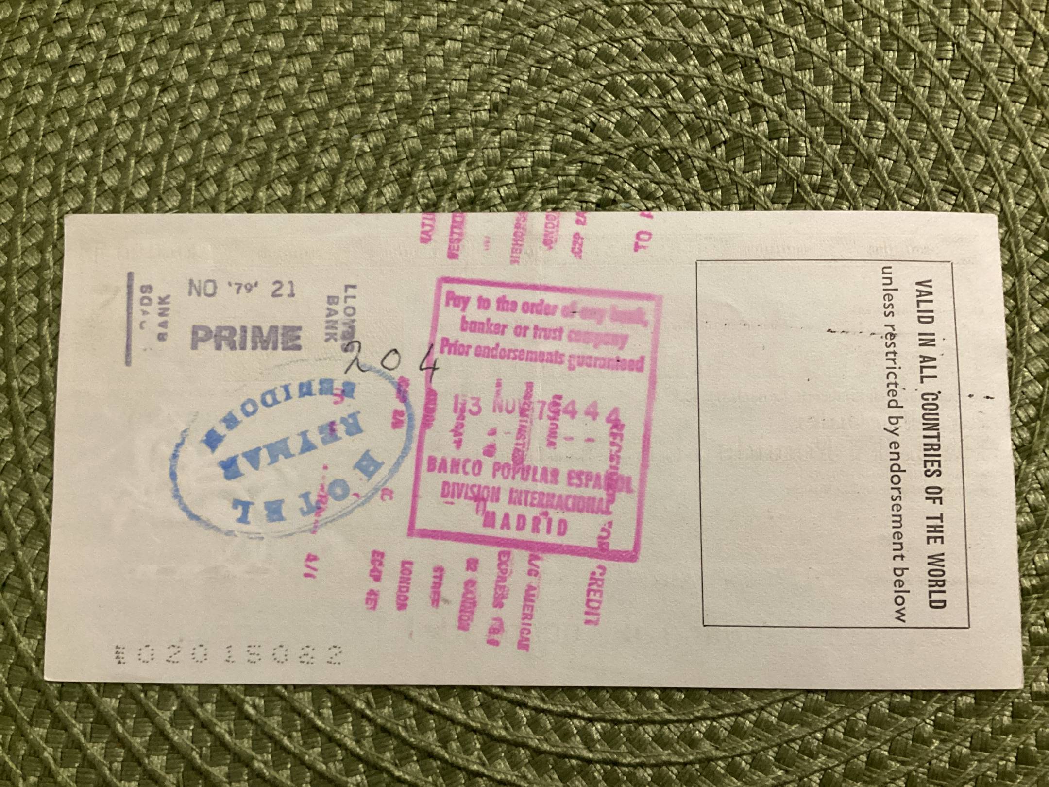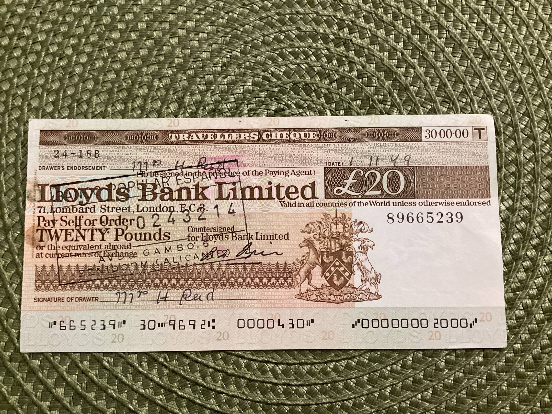 Anglija 20 svaru kelioninis cekis 1949
