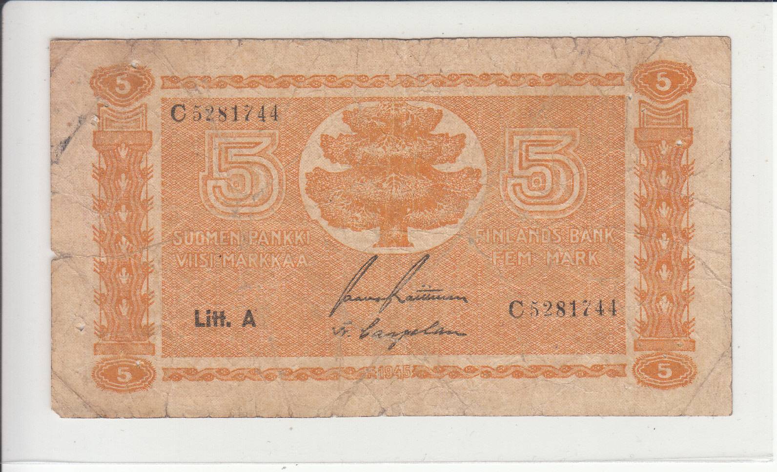 Suomija_5 markės _1945m_nuo 1€!