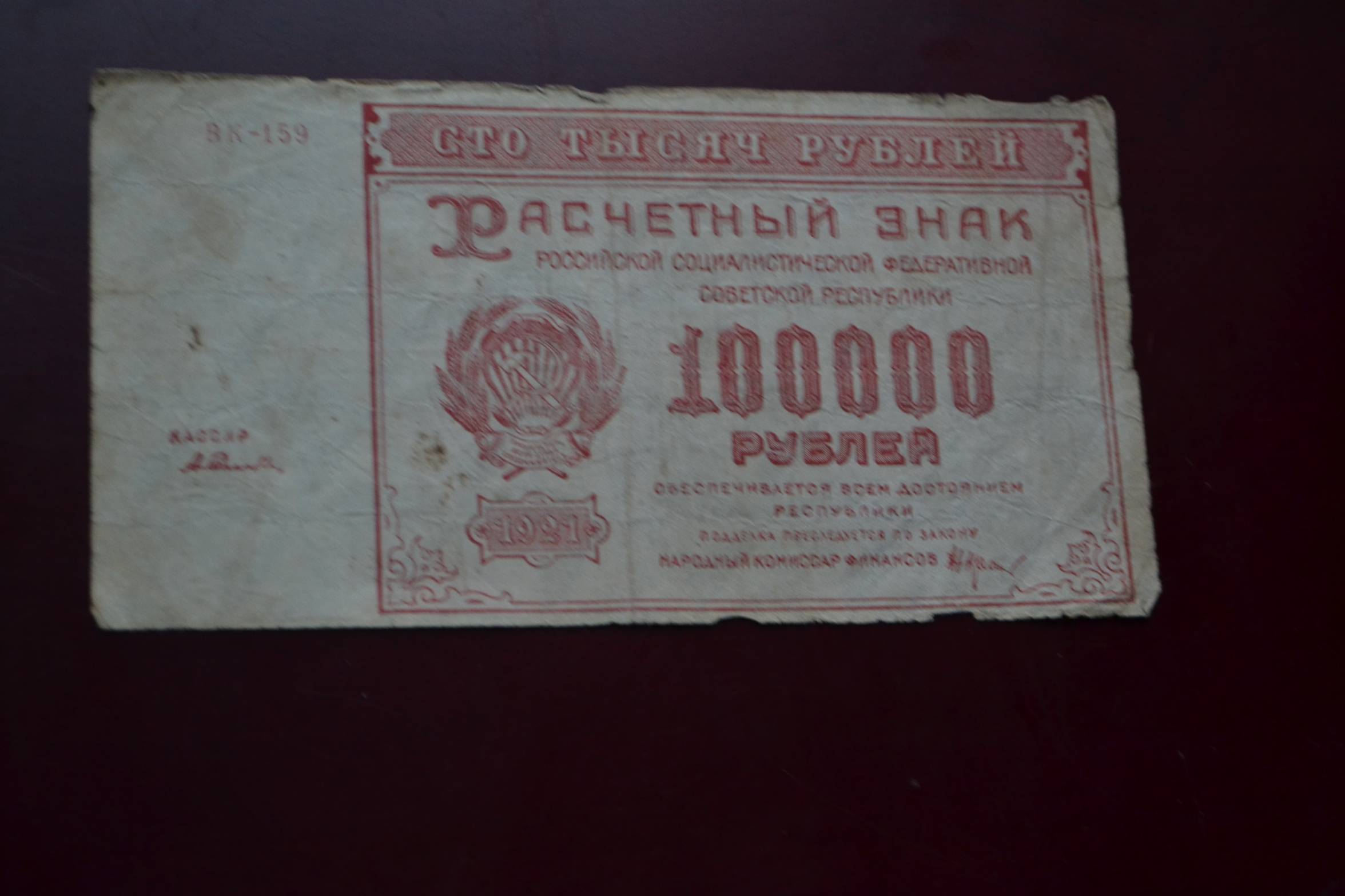 100 000 rubliu 1921 m. BK,nuo 1 Euro