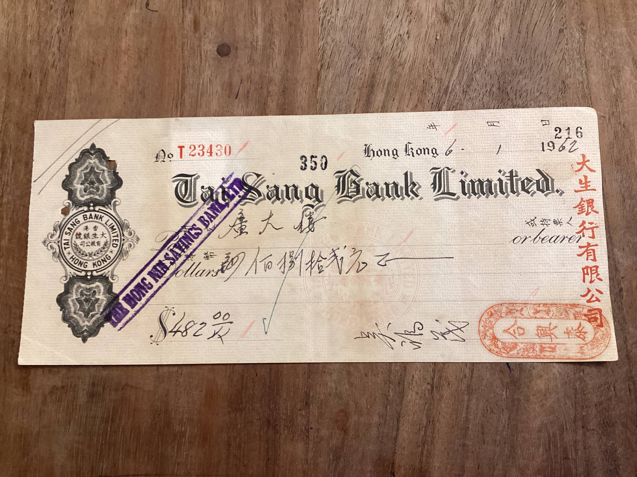Bankinis cekis Hongkongas. 1962