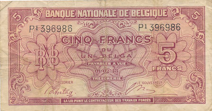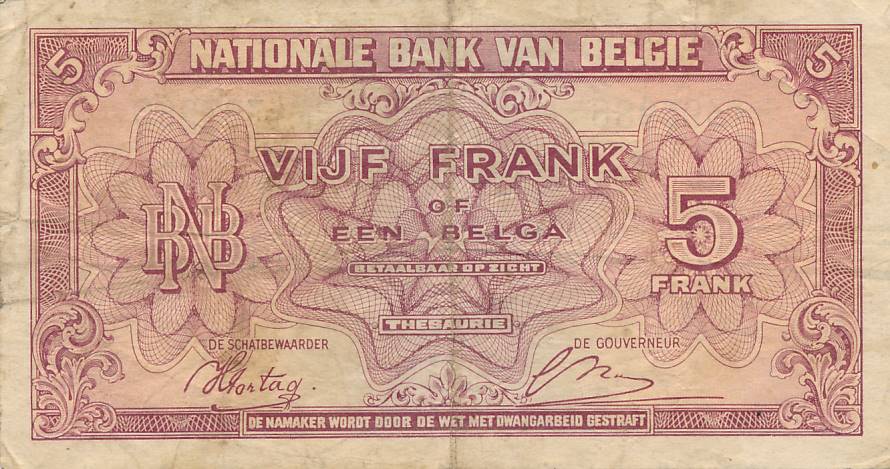 Belgija - 1943 - 5 frankai - nuo euro