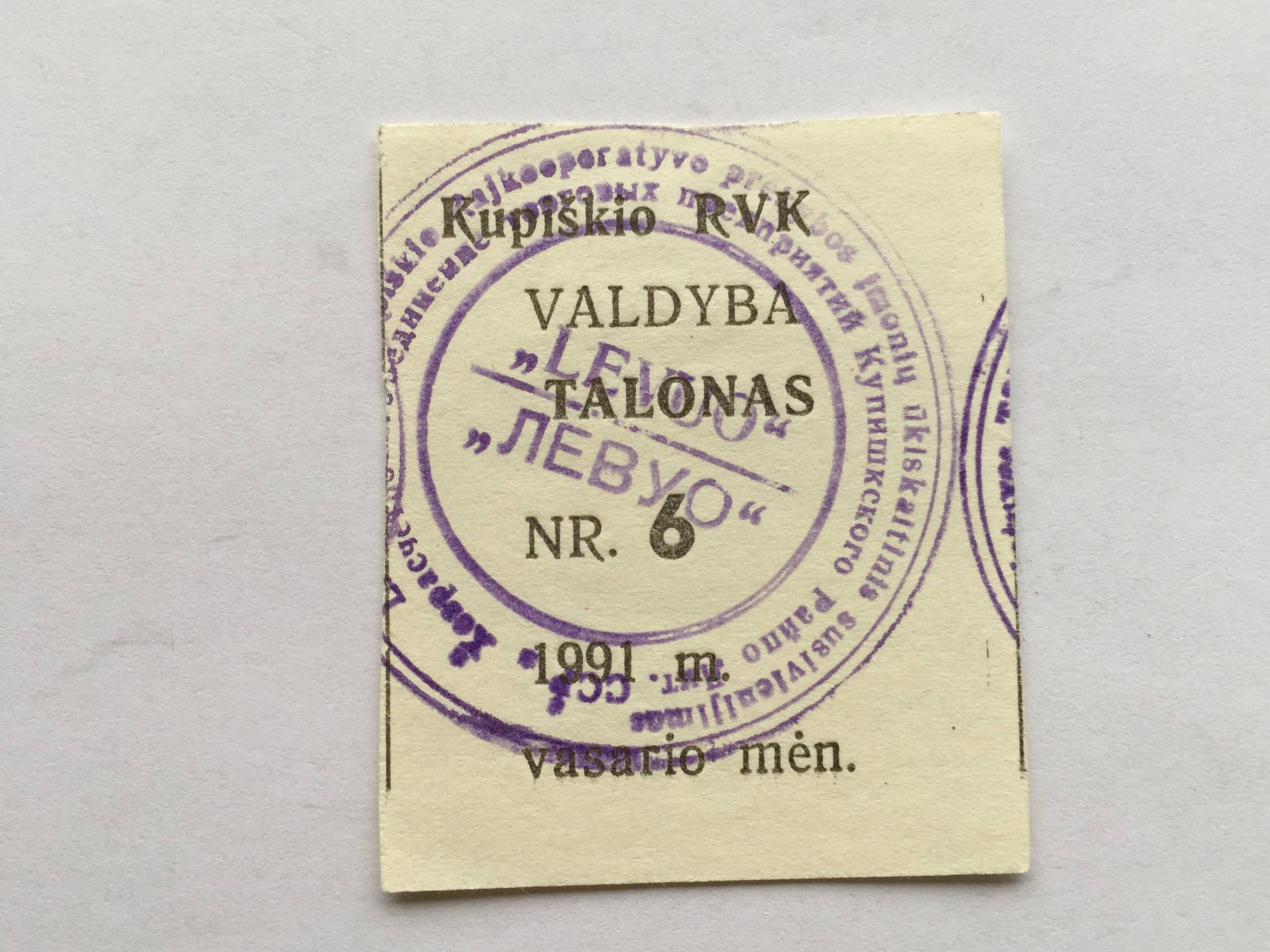 Talonas prekėms Kupiškis 1991m.