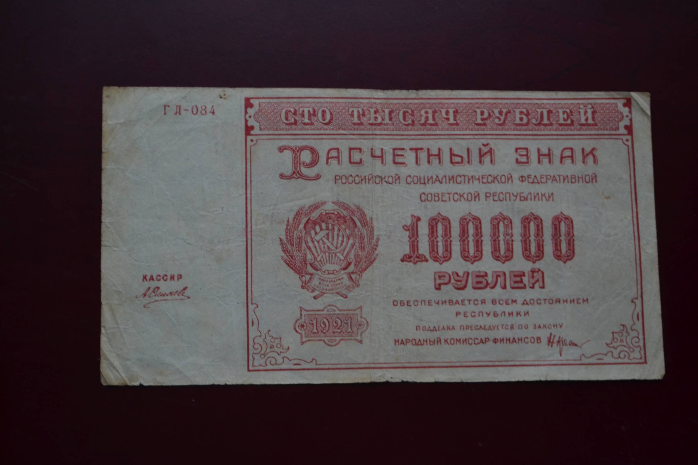 100 000 Rubliu 1921 m.. Nuo 1 Euro