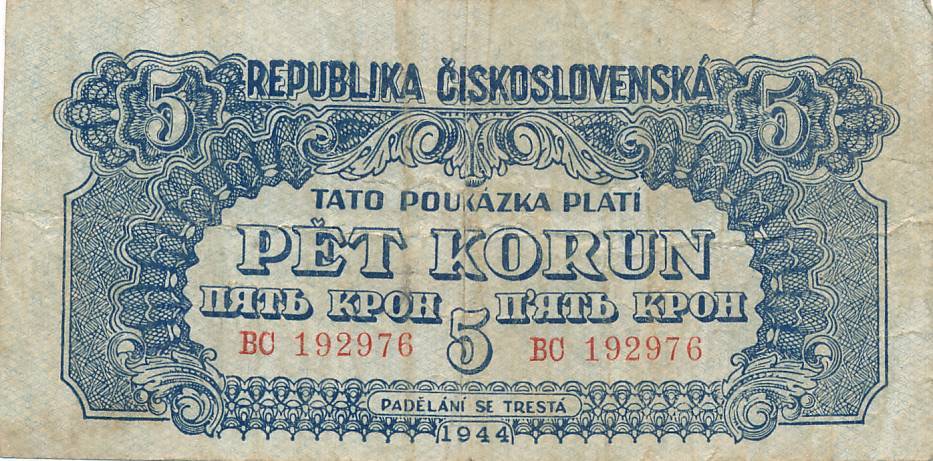 Cekoslovakija - 1944 - 5 korunos - nuo euro