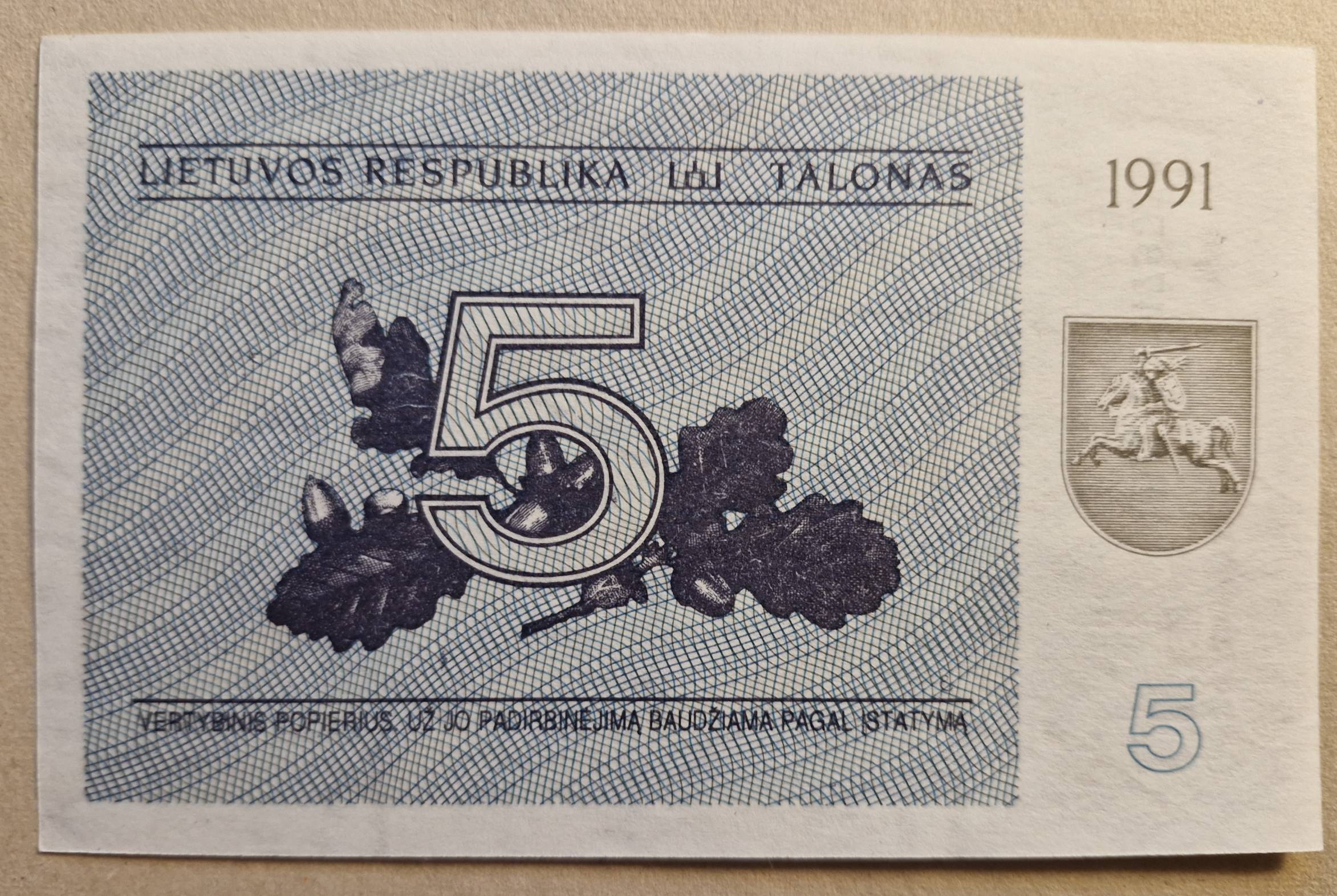 5 Tal 1991 m. Su užrašu aUNC Lietuva - Nuo 1 Eur