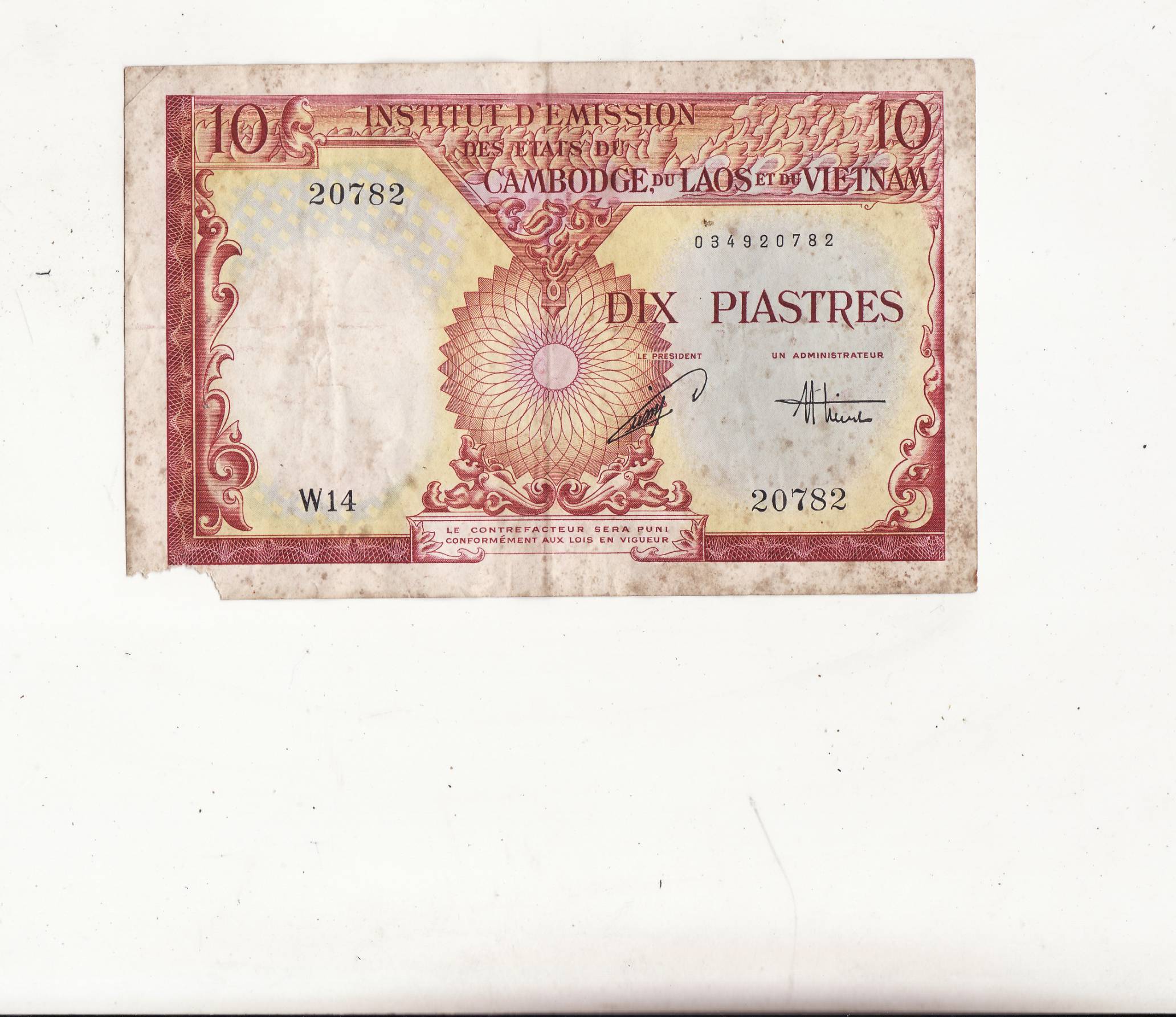 French Indochina 10piastr.1953m.P107