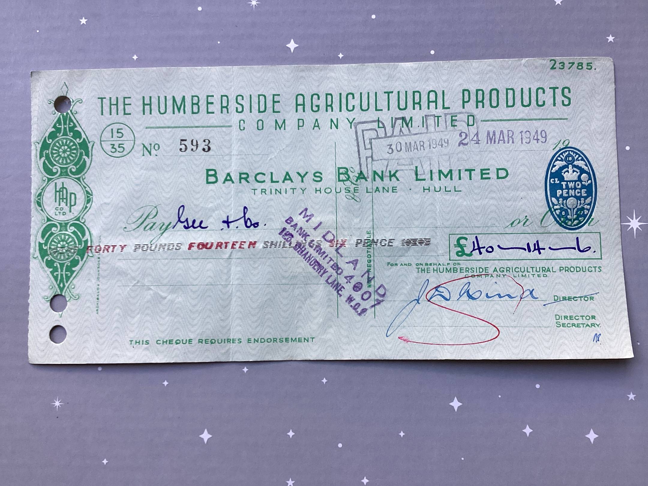 Bankinis cekis Anglija 1949