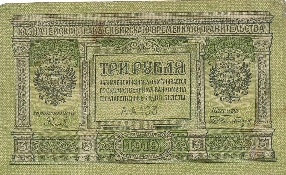 Rusija - Sibiras - 1919 - 3 rubliai - nuo euro
