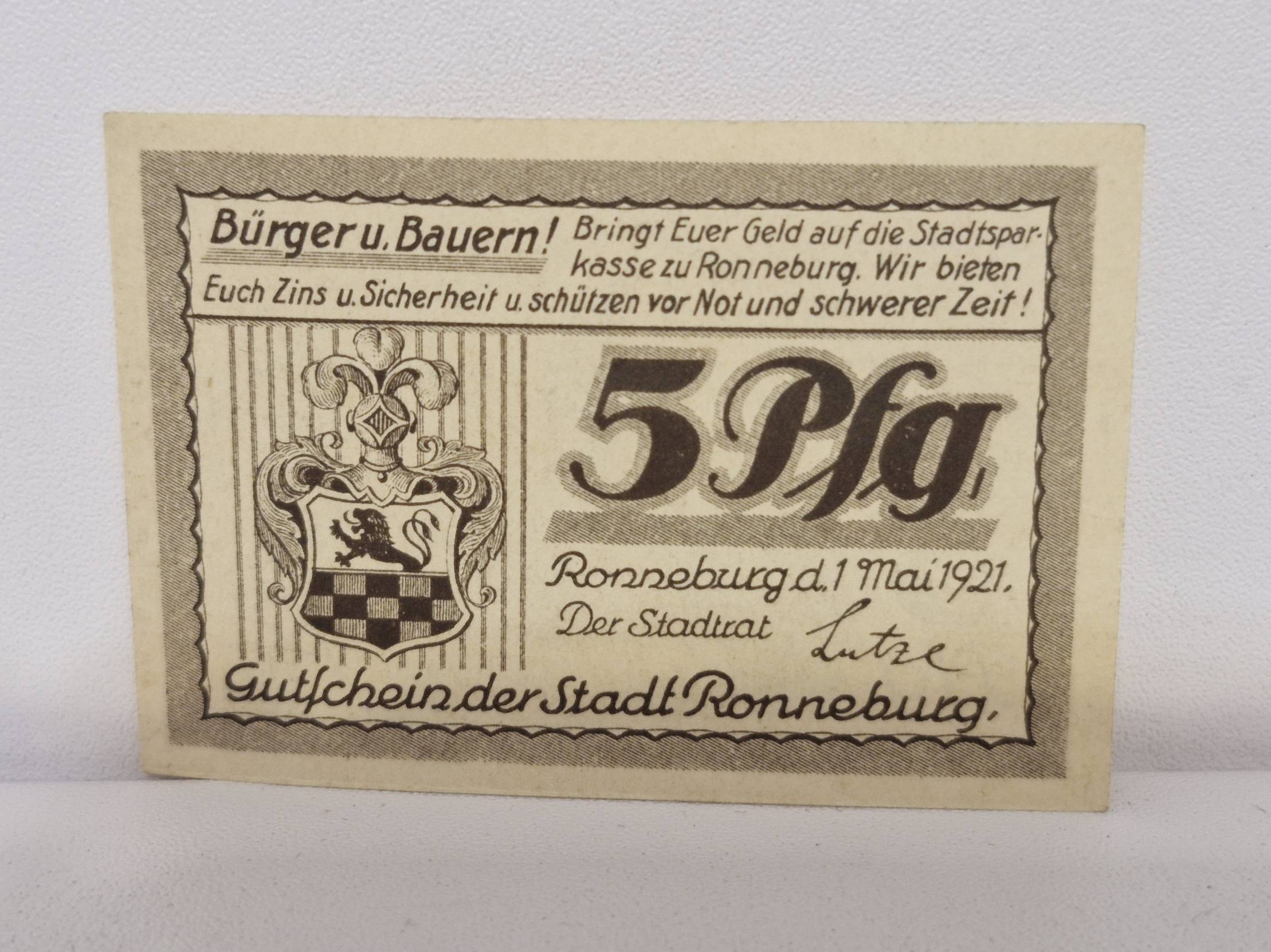 5 Pfennig 1921.05.01 Ronneburg Notgeld Vokietija