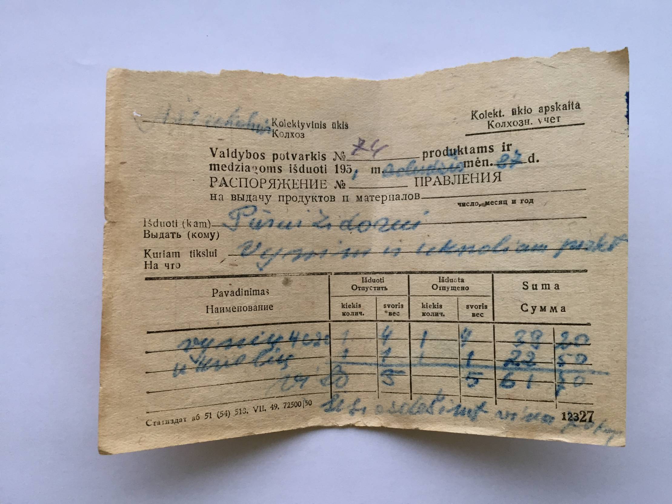 Kvitas 1951m. Nr.74 Vynim ir unkoliam pirkti