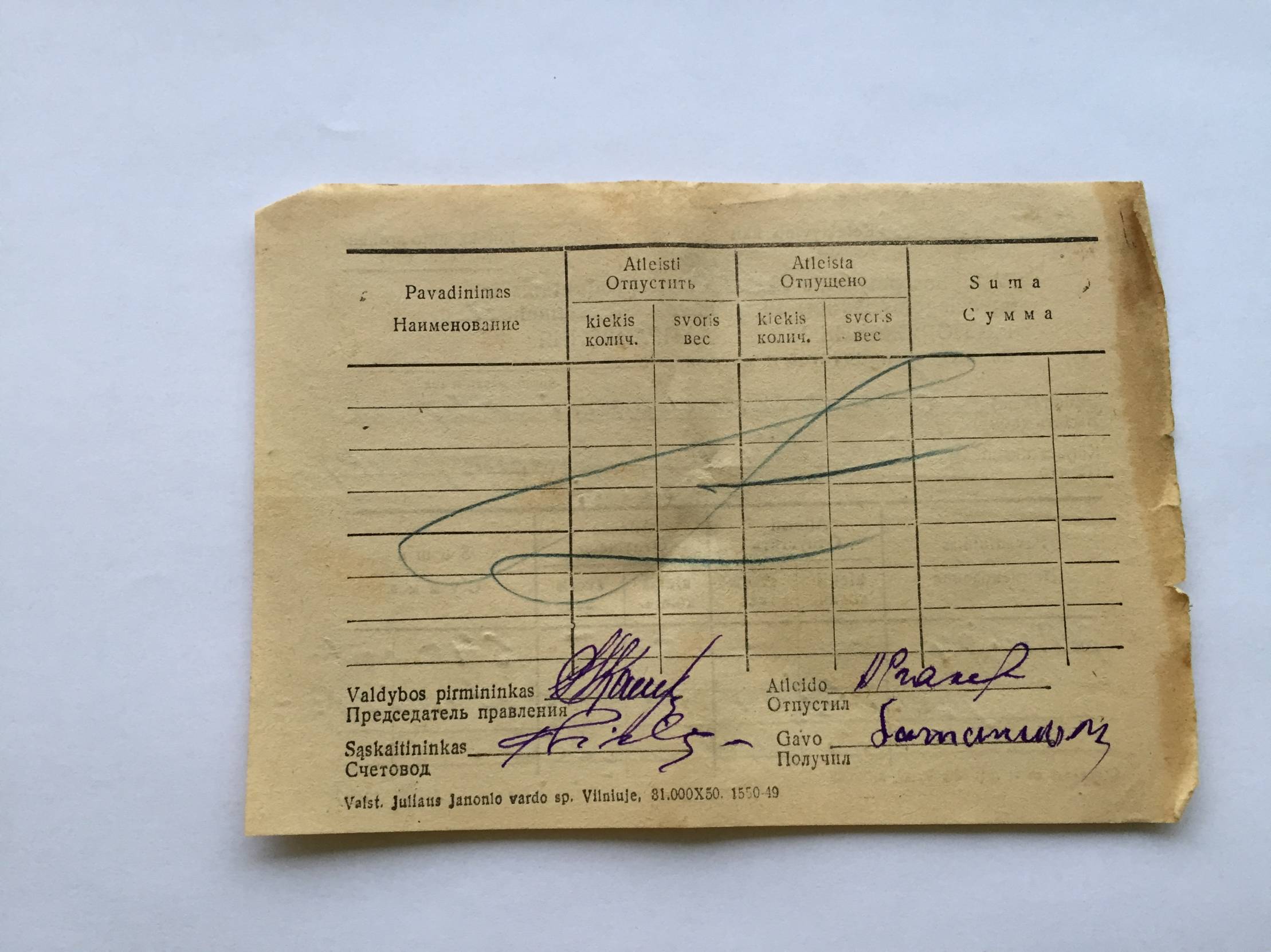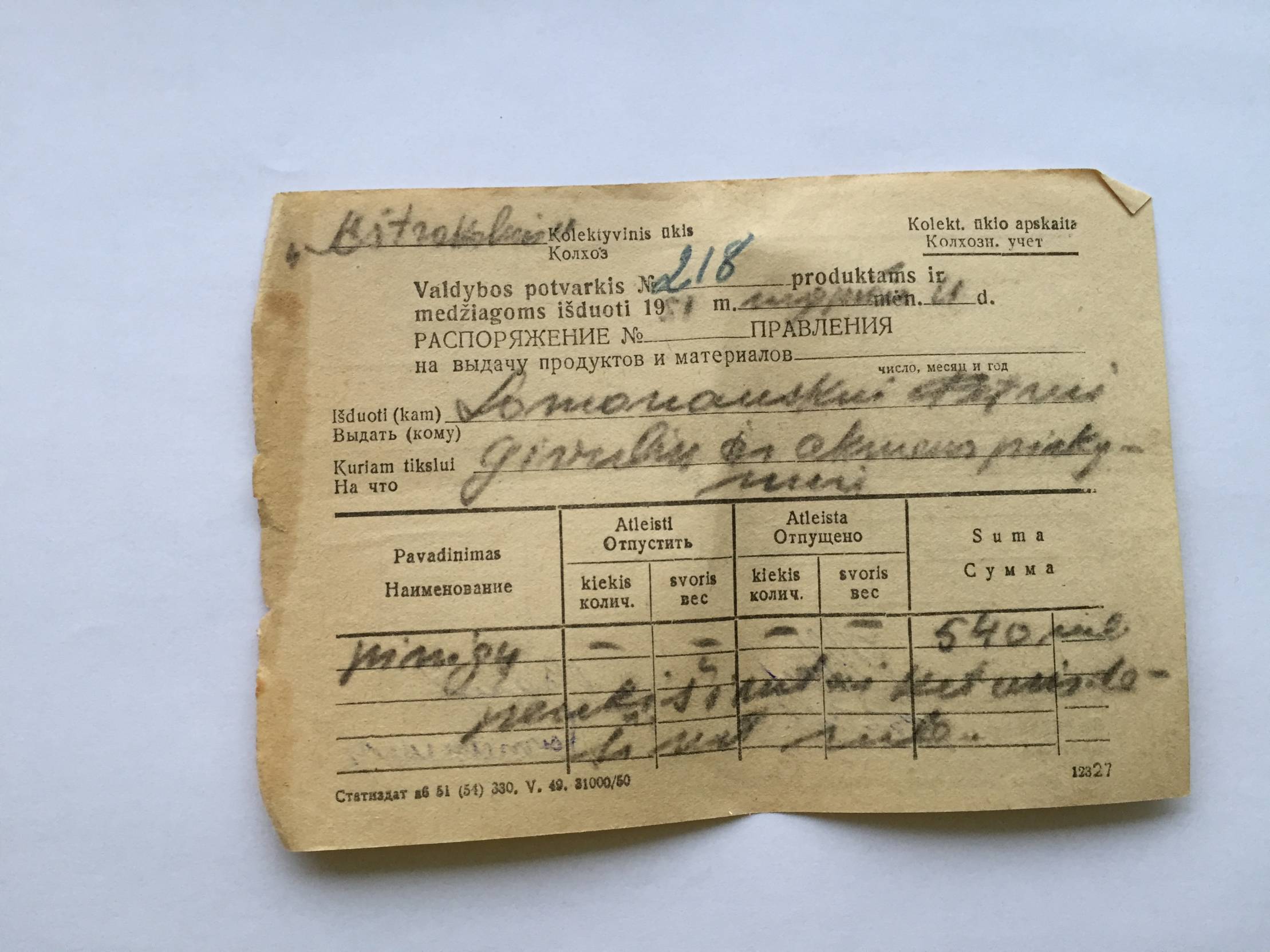 Kvitas 1951m. Nr.218 Gyvulių ir akmens pirkimui