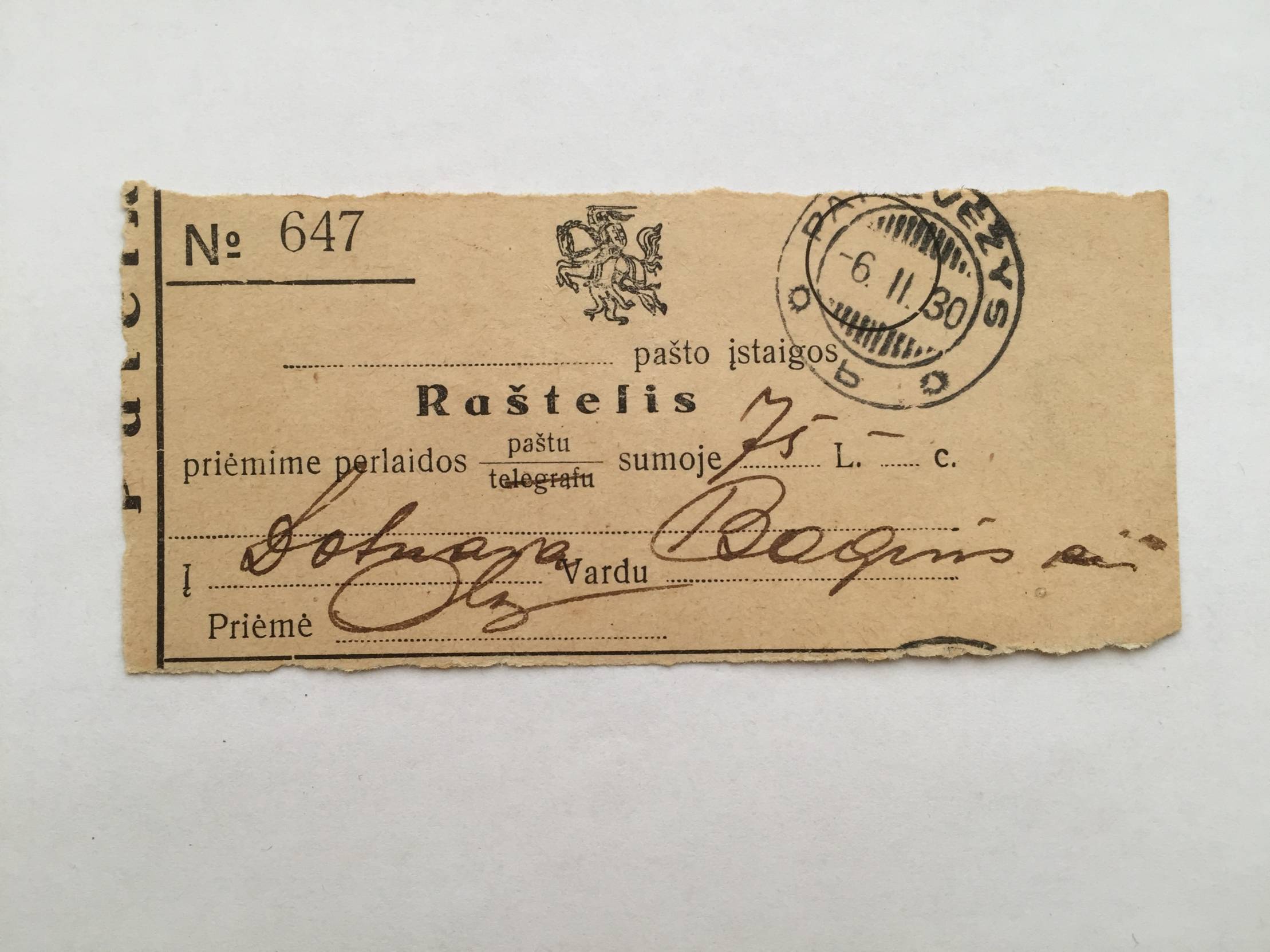Raštelis Panevėžio paštas 1930m.