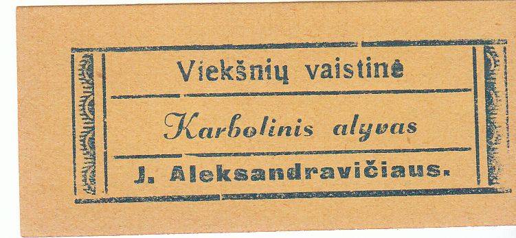 Viekšnių vaistinės etiketė karbolinis alyvas 1930