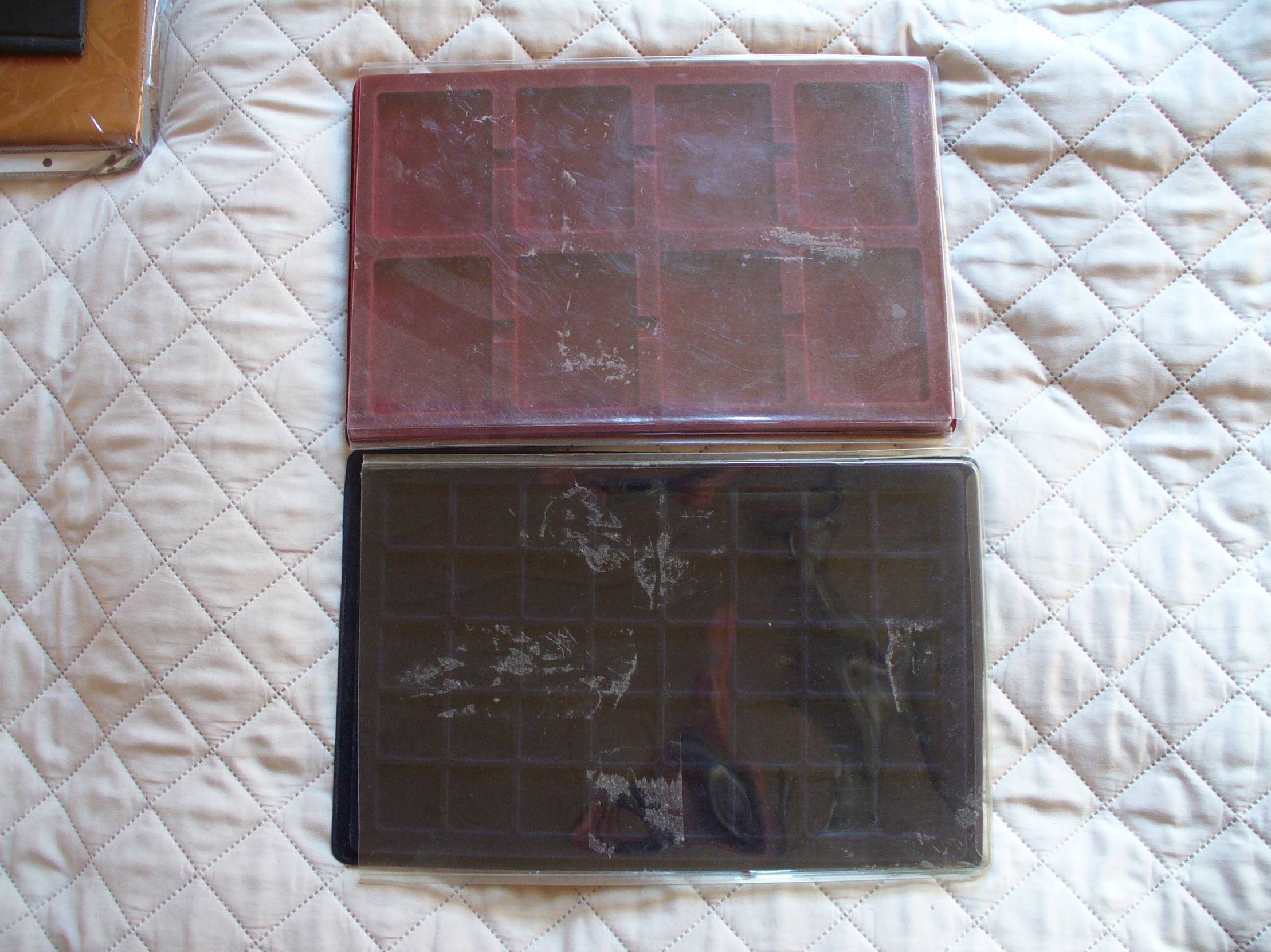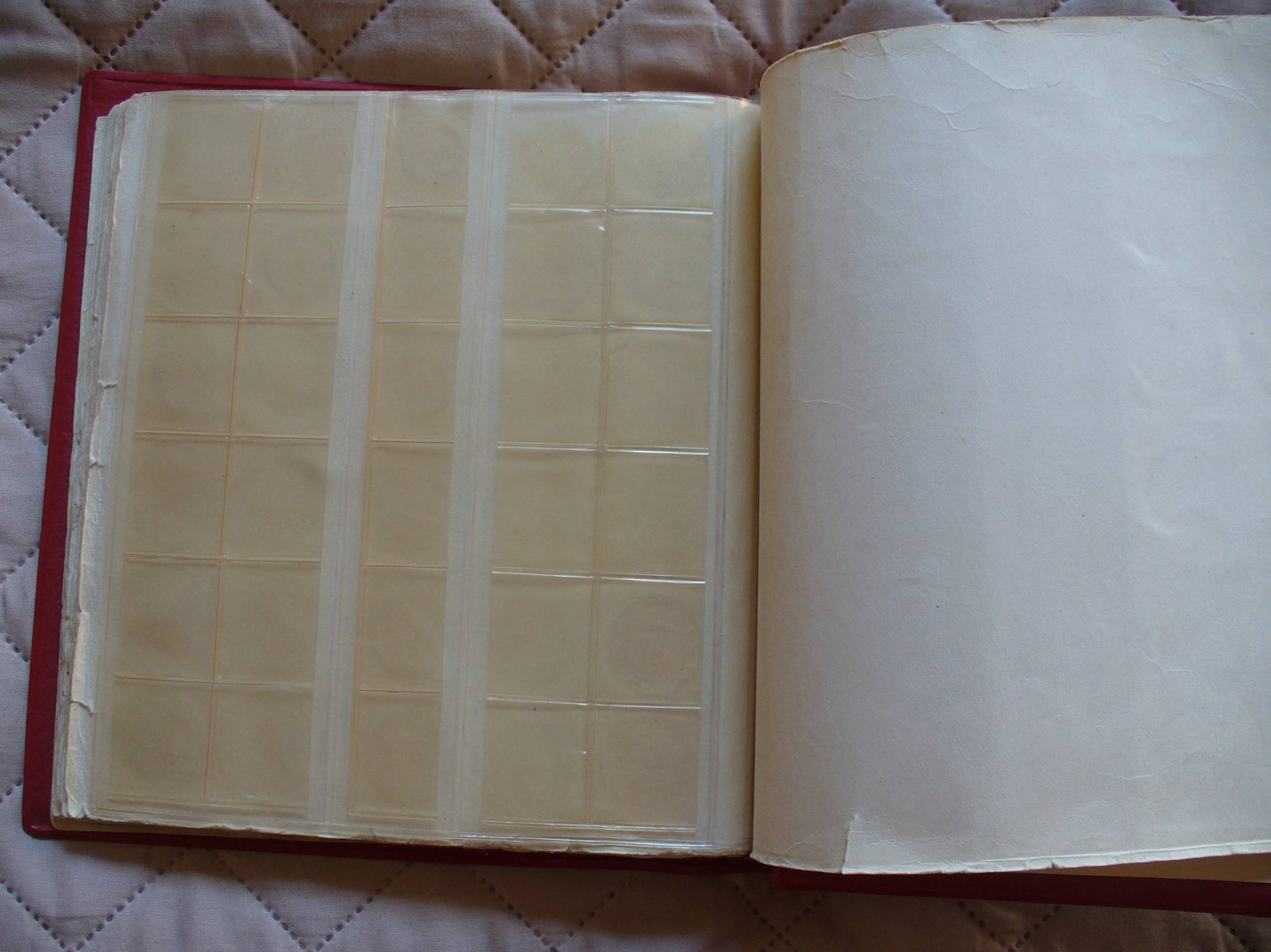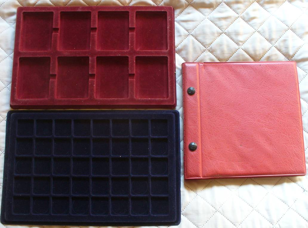1. Paletė Sertifikuotoms monetoms. Naudota, dangtelis suteptas ir palūžęs. Langelio dydis 65x85 mm 2. Paletė. TYP 40. Naudota, dangtelis suteptas ir palūžęs. Langelis 33x33 cm. 3.Albumas monetoms.Naudotas. Telpa 138 monetos